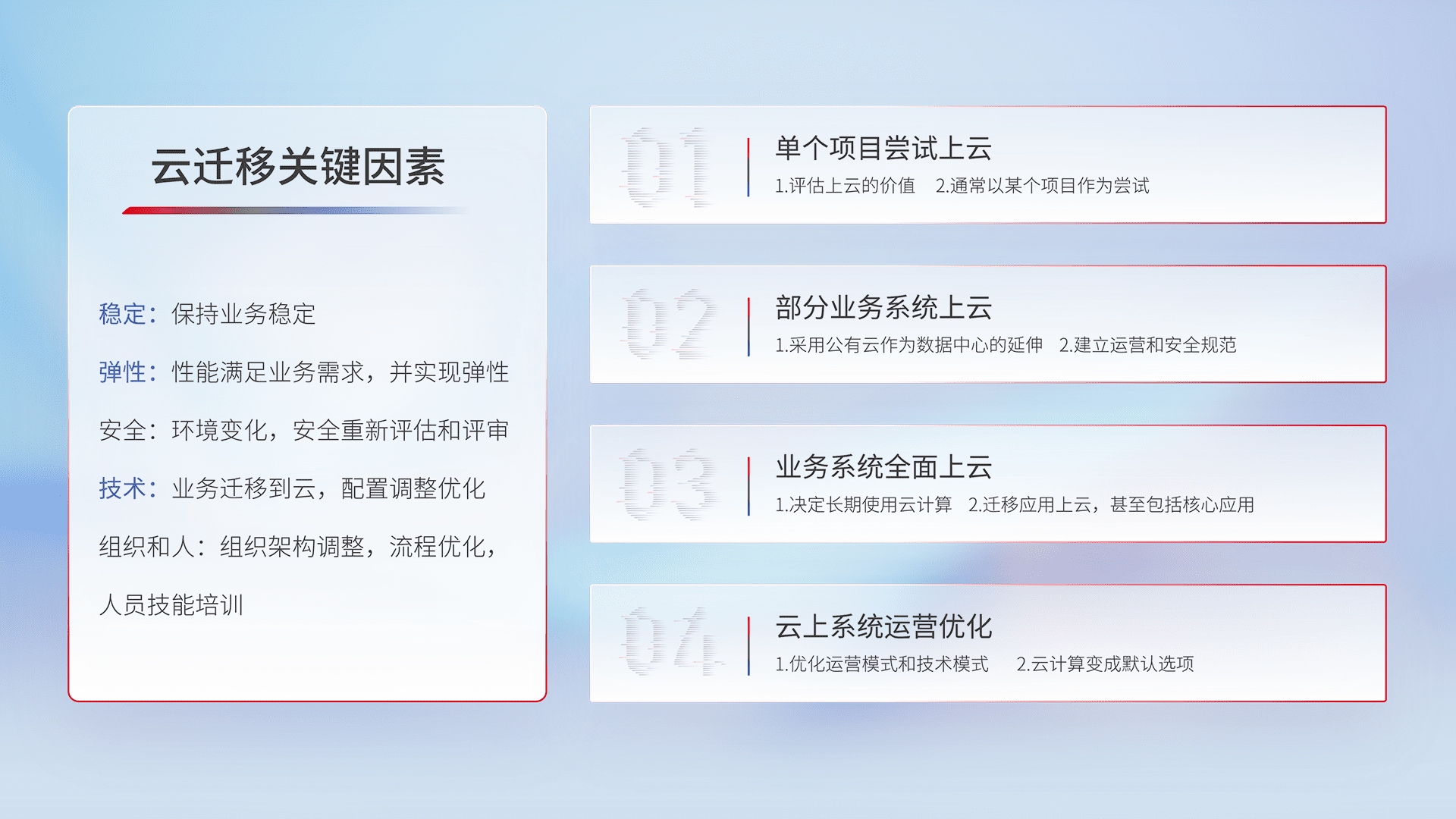 结合实际业务,,,,从规划设计、、、、云平台选型、、、、云原生改造、、数据迁移、、、集成交付,,迁移全过程为客户识别最佳上云路径,,,做好风险识别管理,,,设计网络架构、、身份权限、、、、安全审计合规、、操作审计、、、日志审计、、、、监控告警策略、、、、多站点容灾设计等,,对云上基础设施进行整体规划,,,,提升IT治理水平,,,以满足弹性、、高可用、、高性能的需求。。。