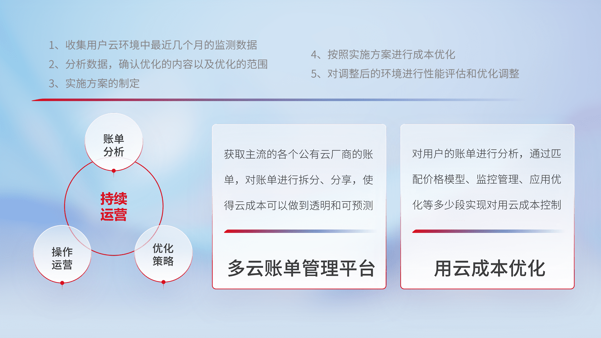 通过多云纳管,,,,以统一的资源数据模型把客户的云资源进行抽象和封装,,进而实现对多云资源的统一操作,,保障云资源管理的可靠性、、、稳定性与可用性。。。。量身定制化运维内容,,,,配置、、、开发运维、、、、补丁管理、、备份、、监控、、、、认证和访问管理、、、审计和日常巡检等,,,保障在用云过程中的可靠度,,稳定度以及高可用率。。。