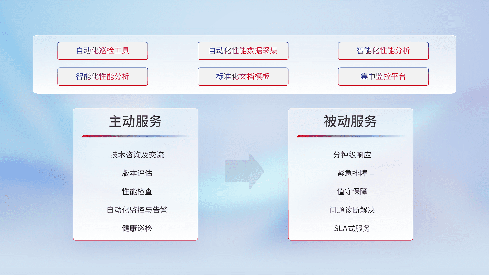 智能化工具和标准化文档,,保障服务质量,,提供主动服务(包含技术咨询、、、版本评估、、、性能检查、、、、自动化监控与告警、、、健康巡检)和被动服务包含(分钟级响应、、、、紧急排障、、值守保障、、、问题诊断解决、、SLA服务)。。
